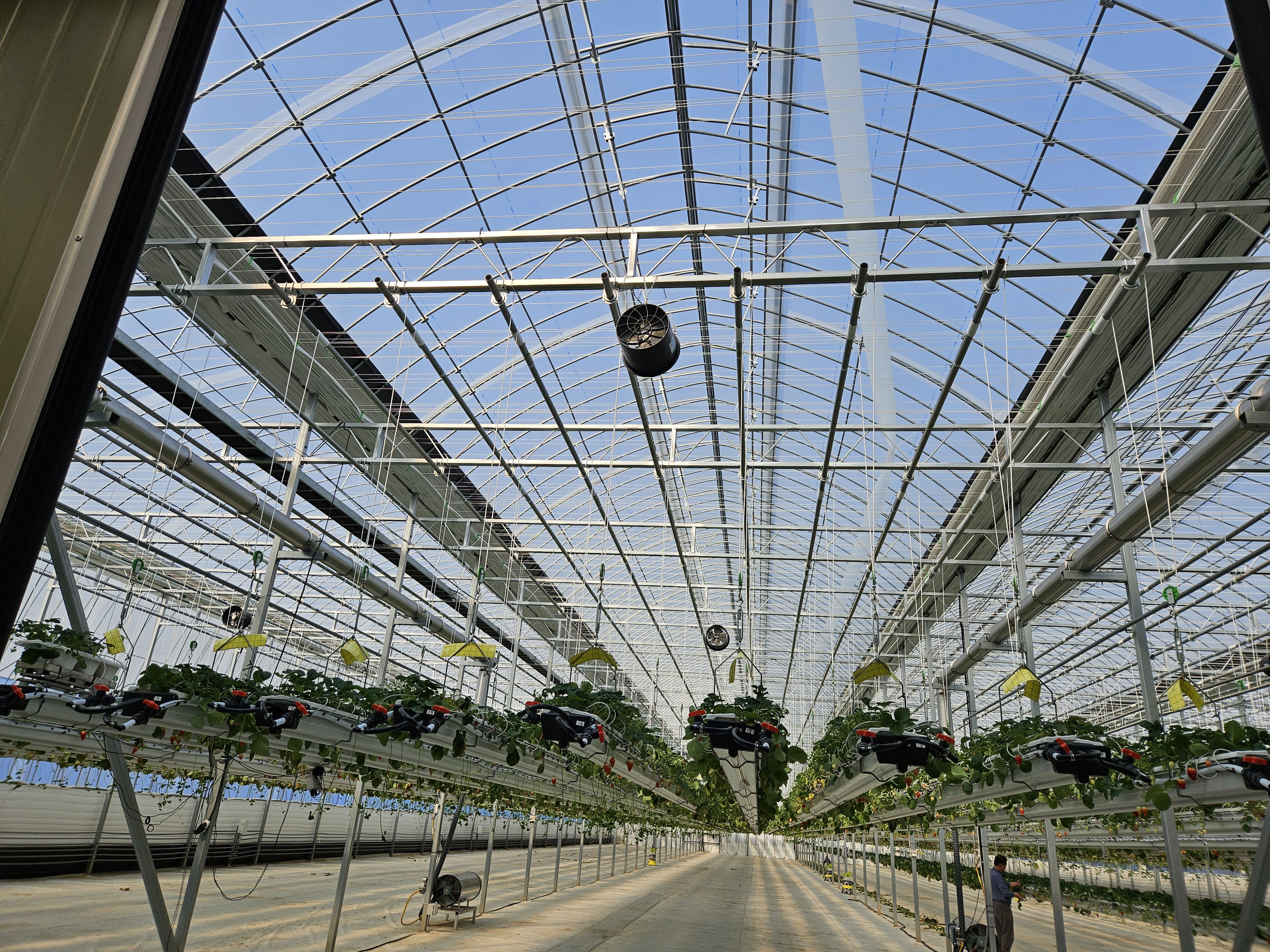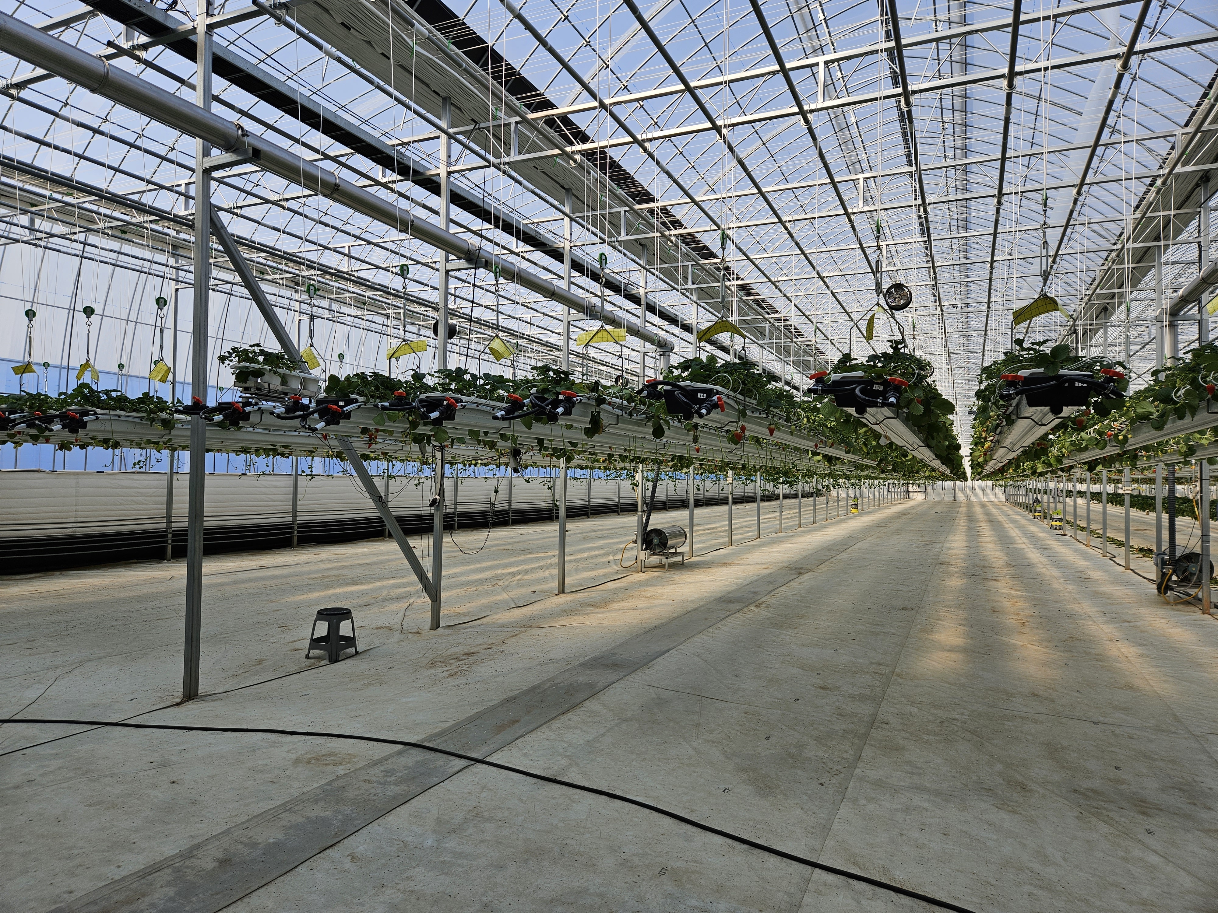 신형 와이드 스판 연동 온실에 행잉거터가 설치된 스마트팜입니다.